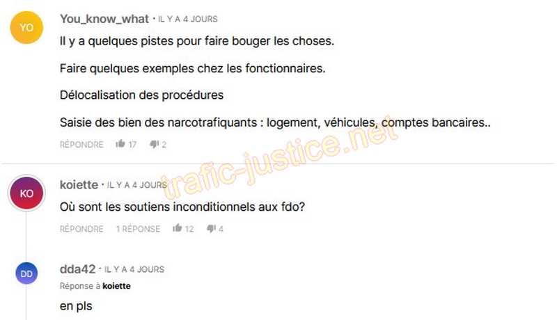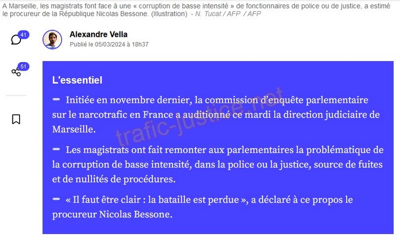 Tiens, ils commencent à ouvrir les yeux côté justice, il était temps. Mais comment lutter contre des gens qui engrangent des milliers d'Euro par jour. Certains dans leurs post écrivent "Saisie des bien des narcotrafiquants : logement, véhicules, comptes bancaires" très bien et très juste, j'y rajouterai peines de prison lourdes, effectives et d'office, d/échéance des droits ci/viques, pour les étrange/rs pertes de la nation/alité française avec ren/voi après avoir effectué sa peine de prison. Mais nos fonctionnaires qu'ils soient dans la police ou dans la fonction publique, doivent eux aussi subir les mêmes peines avec impossibilité d'y retravailler. Car il serait difficile pour ces gens payés moins de 2000€ de résister à des montants doublant, voir plus, leur salaire pour une corruption même de basse intensité, sauf à savoir qu'ils peuvent tout perdre s'ils sont pris.
