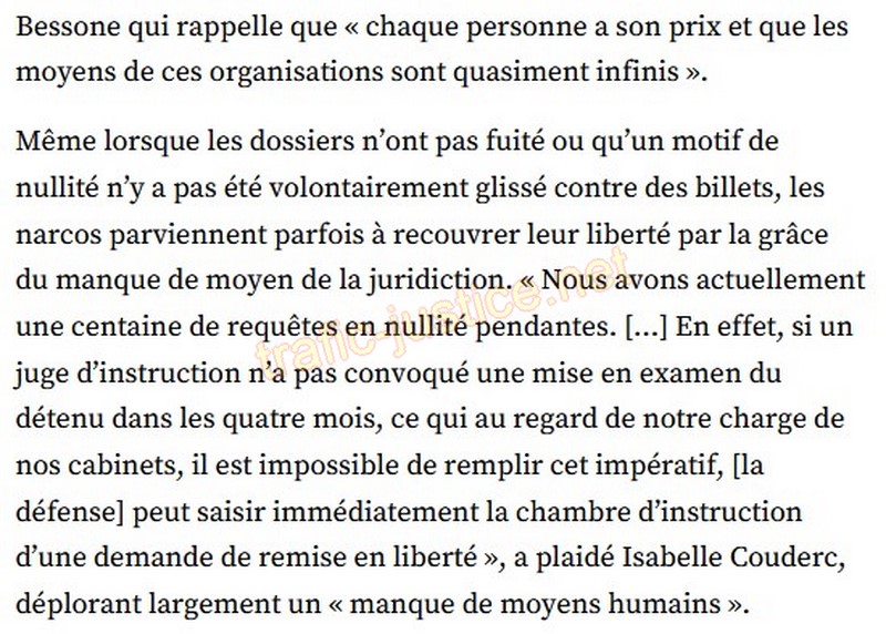 Même lorsque les dossiers n'ont pas fuité ou qu'un motif de nullité n'y a pas été volontairement glissé contre des billets, les narcos parviennent parfois à recouvrer leur liberté par la grâce du manque de moyen de la juridiction. « Nous avons actuellement une centaine de requêtes en nullité pendantes. […] En effet, si un juge d'instruction n'a pas convoqué une mise en examen du détenu dans les quatre mois, ce qui au regard de notre charge de nos cabinets, il est impossible de remplir cet impératif, [la défense] peut saisir immédiatement la chambre d'instruction d'une demande de remise en liberté », a plaidé Isabelle Couderc, déplorant largement un « manque de moyens humains ».
