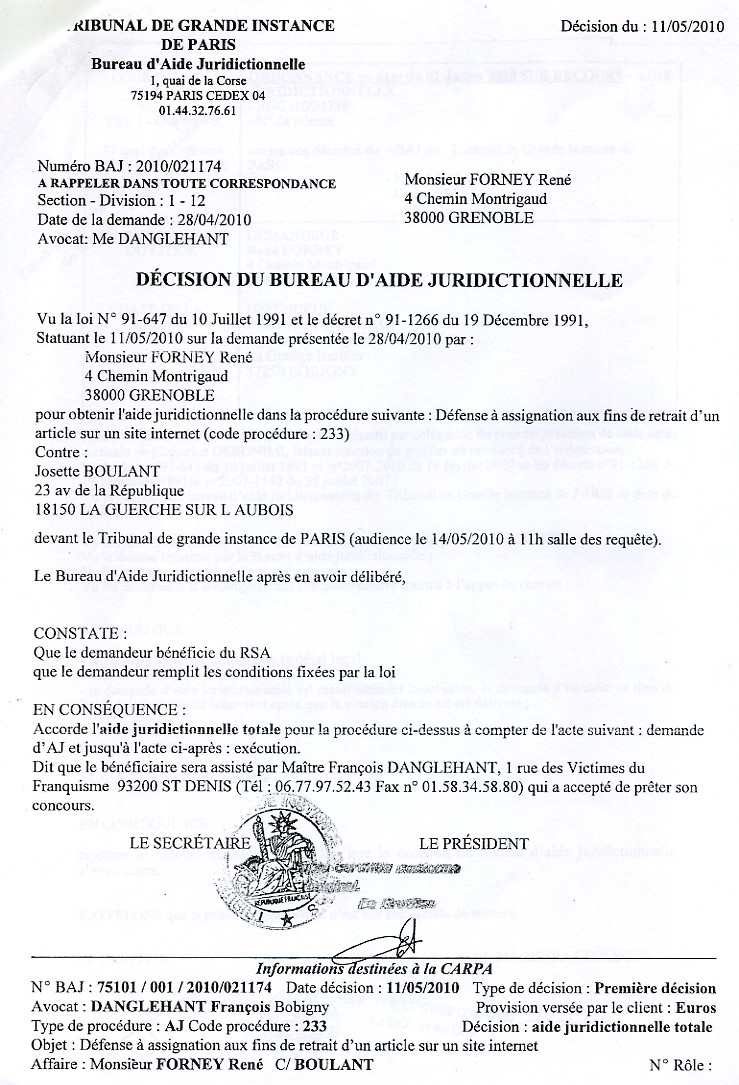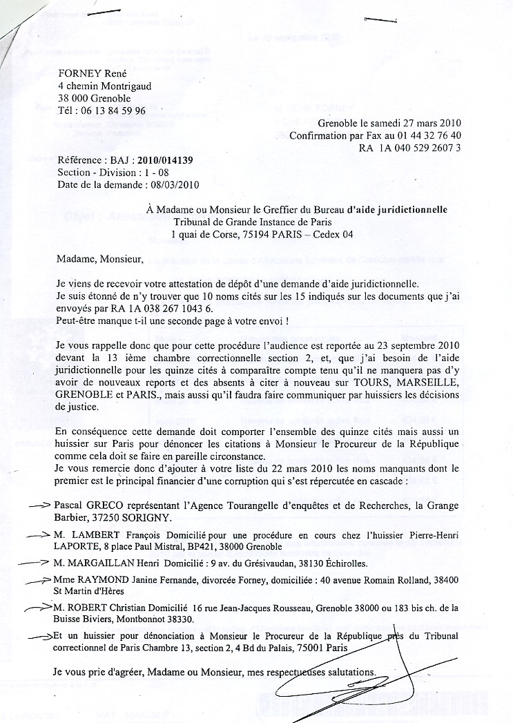 René FORNEY, 4 ch. Montrigaud, 38000 Grenoble Grenoble le jeudi 21 octobre 2010 Objet : Mise sous séquestre ou autre mesure en urgence. Tribunal Correctionnel - 13 ème chambre, 2 section - 4 Bd du Palais, 75004 PARIS À Monsieur Olivier GERON, Président de l'audience correctionnelle du 23 sept. 2010. Motif de l'intervention A - Par décision en audience du 23 septembre 2010 devant la 13 e Chambre 2 e Section du Tribunal correctionnel de Paris, Monsieur le juge GERON Olivier a fixé une consignation à 4.000 € à verser avant le 15 novembre 2010 (Affaire N° 0930108071) malgré ma situation au RSA depuis plusieurs années, malgré mes justificatifs (pièce 201) de 400 € de revenu mensuel . De plus, Monsieur le juge GERON me demande de faire citer à nouveau les absents pour le report au 3 février 2011. B - Je réaffirme être dans l'impossibilité de verser, avant le 15 novembre, cette consignation avec mes moyens connus à ma disposition car ma liquidation de communauté est toujours pendante devant la Cour d'appel de Grenoble (pièce 202).