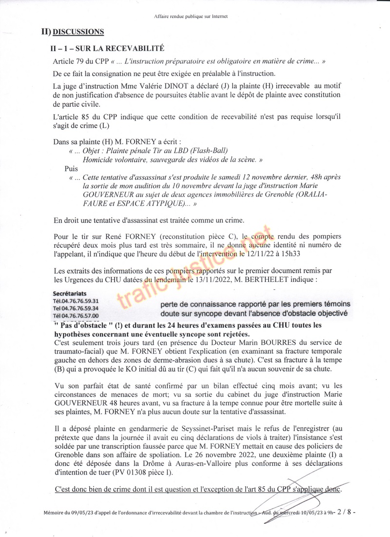 Par une plainte (pièce H) auprès du doyen des juges d'instruction du 7 décembre 2022, M. FORNEY signale la tentative d'assassinat à son encontre par tir létal de Flash-Ball dans sa tempe. Mme Valérie DINOT s'appuie (J) sur l'article 85 du CPP pour déclarer irrecevable la constitution de partie civile du 7 décembre 2022 (H) au motif que :