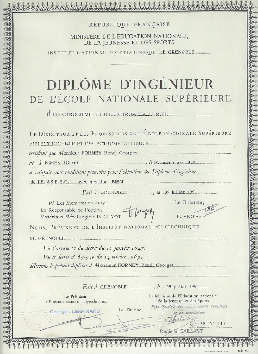 Monsieur FORNEY René, né le 5/11/54 à Nîmes (30-Gard) - Nationalité française - Domicilié 4 ch. Montrigaud, 38000 Grenoble. Ingénieur diplômé de l'INPG* sans emploi.