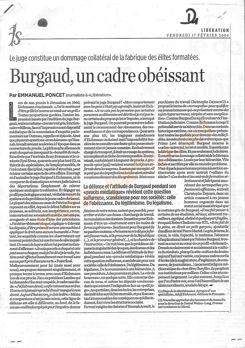 « Burgaud, un cadre obéissant. j'ai été terriblement choqué .d'être présenté comme une machine à appliquer le droit sans aucune humanité » (D1)