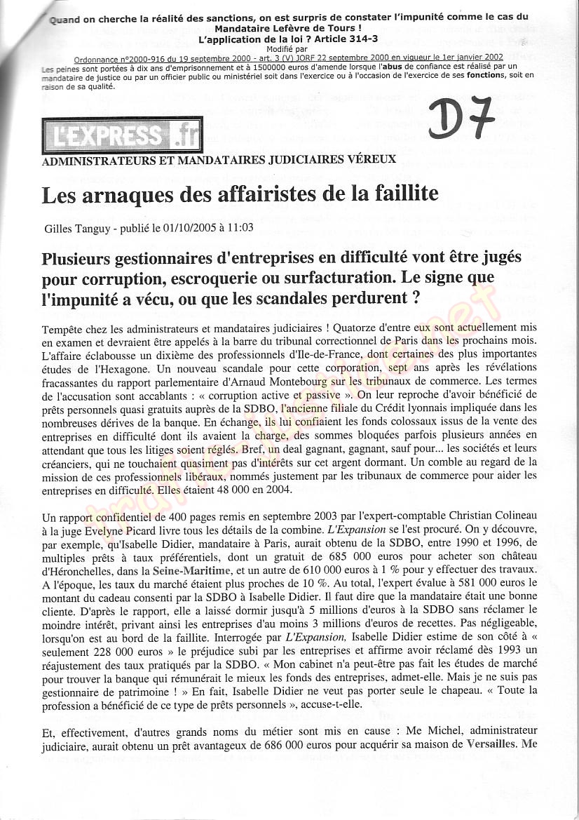 « Les arnaques des affairistes de la faillite. administrateurs et mandataires judiciaires. 581 000 euros de cadeau.détournement de 30 millions d'euros . (D7)