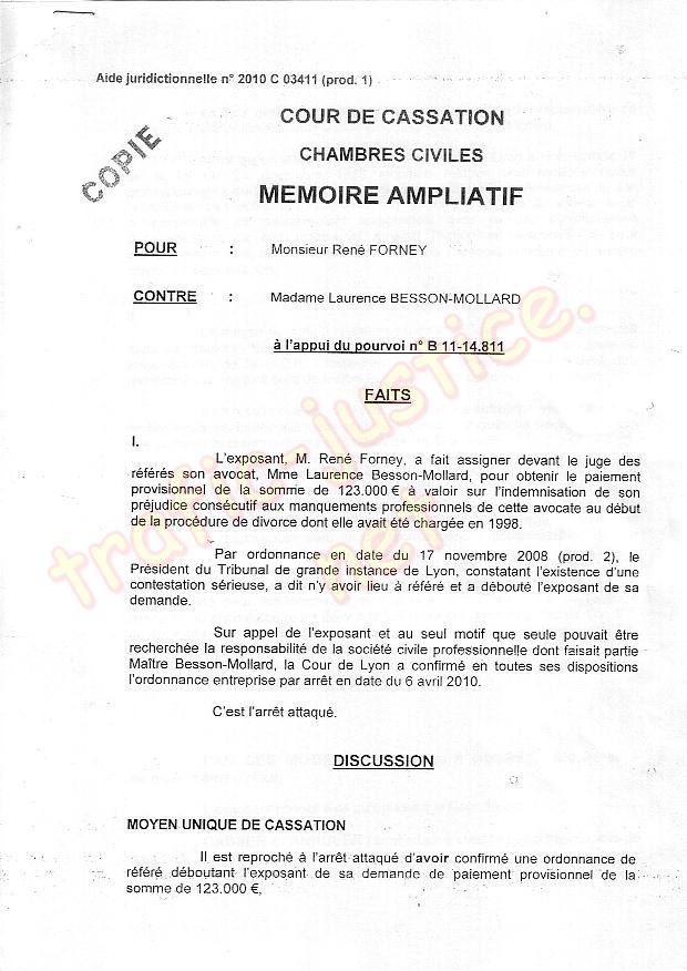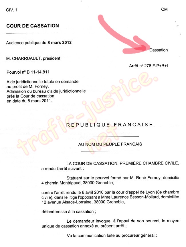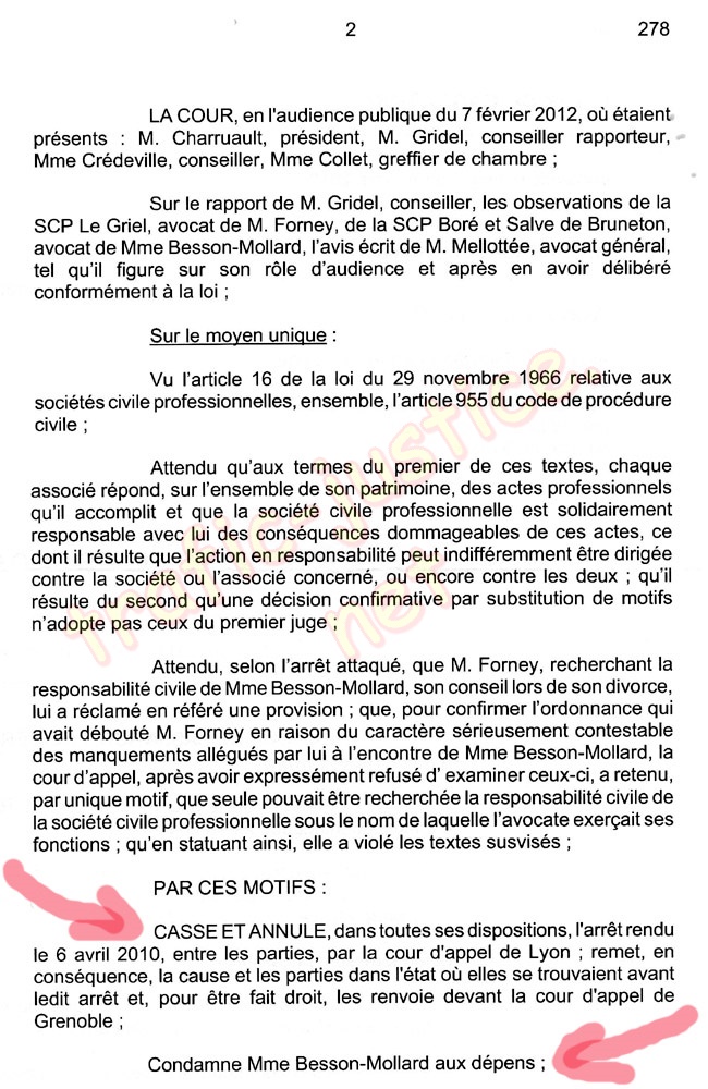Même si la Cour de cassation refusait d'appliquer la loi et la jurisprudence en cassant cet arrêt, une plainte sera déposée pour corruption et trafic d'influence entre les deux avoués et les trois magistrats. Il est inconcevable que les trois magistrats Mme STUTZMANN Jeanne, assesseurs Mme CHAUVE Agnès et Mr LAROQUE Pierre aient pu rendre cet arrêt par erreur en ignorant une loi parfaitement connue de tout juriste. En refusant de rendre justice par un prétexte aussi ubuesque, il devient incontestable que la faute est volontaire pour permettre à Me BESSON-MOLARD d'échapper à la justice. À la plaidoirie de l'audience, les avoués étaient absents, même ceux chargés de défendre mes intérêts comme Me RAHON Alain, l'absence totale de plaidoirie de Me MANDY Sandrine avocate adverse disant remplacer son confrère Jean Christophe BESSY démontre la préparation et l'entente avant l'audience. Il s'agit là au sens du code pénal de corruption en procurant un avantage certains à la partie adverse.