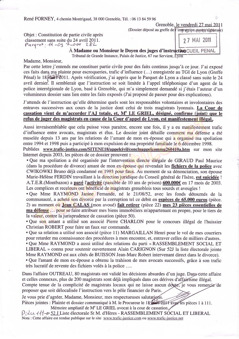 Par cette lettre j'entends me constituer partie civile pour des faits continus jusqu'à ce jour. J'ai exposé ces faits dans ma plainte pour escroqueries, trafic d'influence (.) enregistrée au TGI de Lyon (Greffe Pénal) le 18 février 2011. Après vérification, j'ai appris que le Parquet de Lyon a classé sans suite le 24 avril dernier. Il semblerait que l'instruction se soit limitée à l'appel téléphonique d'un agent de la police interrégionale de Lyon, basé à Grenoble, qui m'a simplement demandé si j'étais l'auteur d'un volumineux dossier sans lien entre les faits exposés (J'ai proposé de passer pour des explications).