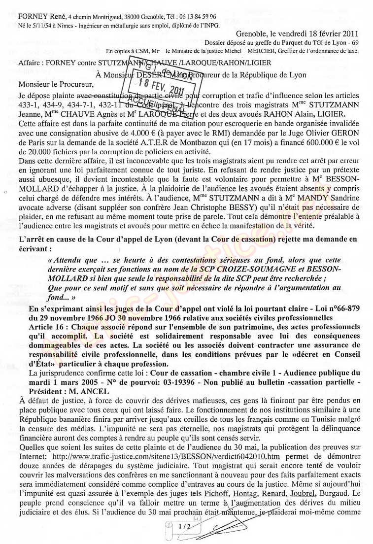 Je dépose plainte xxxxxxxxxxxxxxxxxxx pour corruption et trafic d'influence selon les articles 433-1, 434-9, 434-7-1, 432-11 du Code pénal, à l'encontre des trois magistrats Mme STUTZMANN Jeanne, Mme CHAUVE Agnès et Mr LAROQUE Pierre et des deux avoués RAHON Alain , LIGIER .