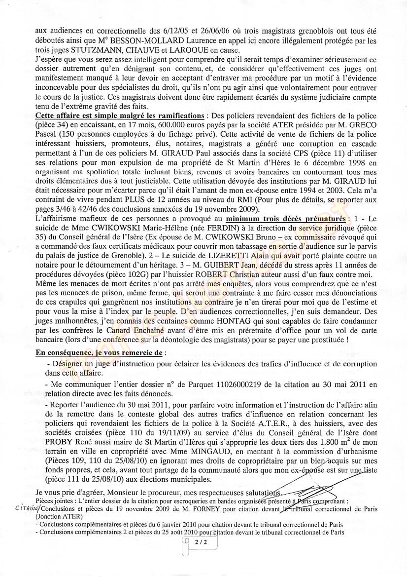 - Reporter l'audience du 30 mai 2011, pour parfaire votre information et l'instruction de l'affaire afin de la remettre dans le conteste global des autres trafics d'influence en relation concernant les policiers qui revendaient les fichiers de la police à la Société A.T.E.R., à des huissiers, avec des sociétés croisées (pièce 110 du 19/11/09) au service d'élus du Conseil général de l'Isère dont PROBY René aussi maire de St Martin d'Hères qui s'approprie les deux tiers des 1.800 m 2 de mon terrain en ville en copropriété avec Mme MINGAUD, en mentant à la commission d'urbanisme (Pièces 109, 110 du 25/08/10) en ignorant mes droits de copropriétaire par un bien acquis sur mes fonds propres, et cela, avant tout partage de la communauté alors que mon ex-épouse est sur une liste (pièce 111 du 25/08/10) aux élections municipales.