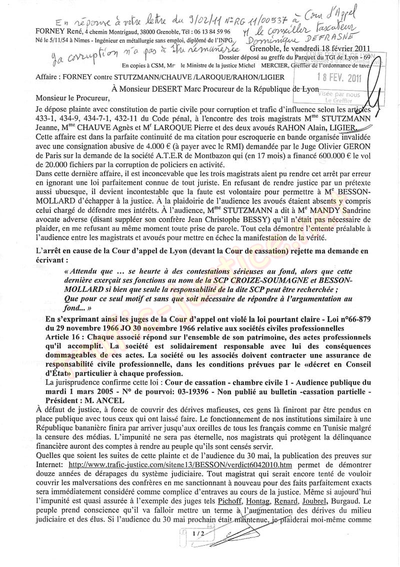 Par cette lettre, je me constitue partie civile suite à des faits continus jusqu'à ce jour. Ma plainte pour escroqueries, trafic d'influence (.) enregistrée au TGI de Lyon (Greffe Pénal) le 18 février 2011. semble avoir eu pour unique suite (entre autres rétorsions) l'appel téléphonique d'un agent de la police interrégionale de Lyon basé à Grenoble, qui m'a simplement demandé si j'étais l'auteur d'un volumineux dossier sans lien entre les faits exposés (J'ai proposé de passer pour des explications). J'extrait (au dessus de ce dossier) les trois pièces 1, 15, 22 qui prouvent que j'ai été jugé sans les pièces de ma défense pour trois jugements successifs . En 13 ans de recours, ces dérives forcément concertées (par un puissant réseau) ont été validées par 200 magistrats (Pour mémoire, 80 magistrats ont validé les dérives du juge Burgaud).