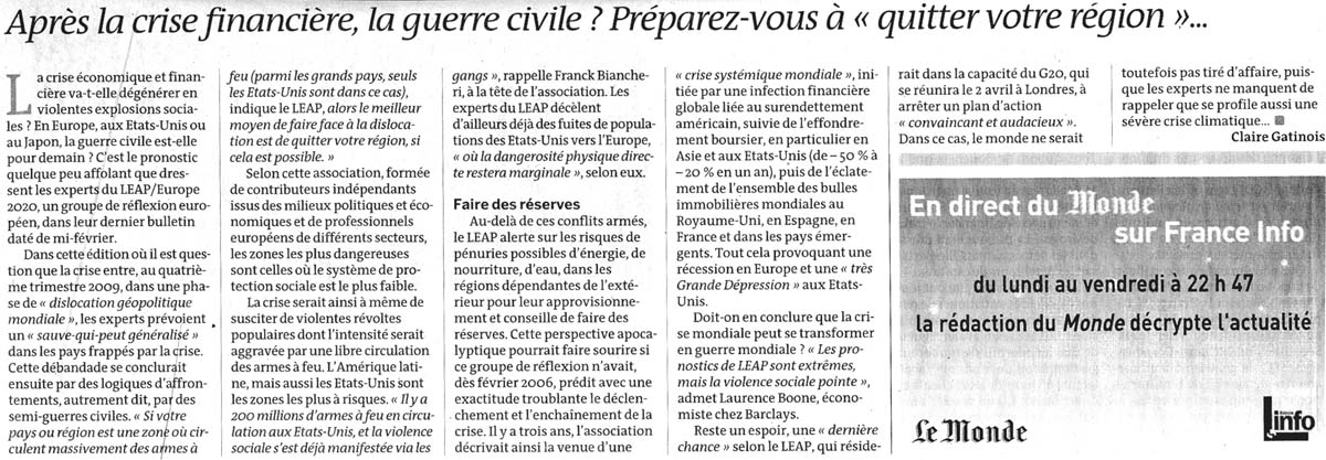 La crise économique et financière va-t-elle dégénérer en violentes explosions sociales ? En Europe, aux Etats-Unis ou au japon, la guerre civile est-elle pour demain ? C'est le pronostic quelque peu affolant que dressent les experts du LEAP/Europe 2020, un groupe de réflexion européen, dans leur dernier bulletin daté de mi-février.