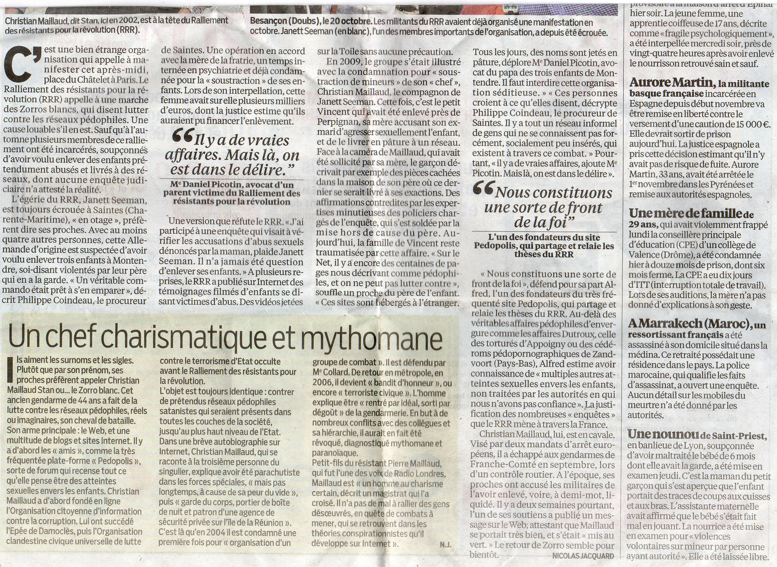 Tous les jours, des noms sont jetés en pâture, déplore Me Daniel Picotin, avocat du papa des trois enfants de Montendre. Il faut interdire cette organisation séditieuse. » « Ces personnes croient à ce qu'elles disent, décrypte Philippe Coindeau, le procureur de Saintes. Il y a tout un réseau informel de gens qui ne se connaissent pas forcément, socialement peu insérés, qui existent à travers ce combat. » Pourtant, « il y a de vraies affaires, ajoute Me Picotin. Mais là, on est dans le délire ». "Nous constituons une sorte de front de la foi" L'un des fondateurs du site Pedopolis, qui partage et relaie les thèses du RRR « Nous constituons une sorte de front de la foi », défend pour sa part Alfred, l'un des fondateurs du très fréquenté site Pedopolis, qui partage et relaie les thèses du RRR. Au-delà des véritables affaires pédophiles d'envergurc comme les affaires Dutroux, celle des torturés d'Appoigny ou des cédéroms pédopornographiques de Zandvoort (Pays-Bas), Alfred estime avoir connaissance de « multiples autres atteintes sexuelles envers les enfants, non traitées par les autorités en qui nous n'avons pas confiance ». La justification des nombreuses « enquêtes » que le RRR mène à travers la France. Christian Maillaud, lui, est en cavale. Visé par deux mandats d'arrêt européens, il a échappé aux gendarmes de Franche-Comté en septembre, lors d'un contrôle routier. A l'époque, ses proches ont accusé les militaires de l'avoir enlevé, voire, à demi-mot, liquidé. Il y a deux semaines pourtant, l'un de ses soutiens a publié un message sur le Web; attestant que Maillaud se portait très bien, et s'était « mis au vert. » Le retour de Zorro semble pour bientôt. NICOLAS JACQUARD |