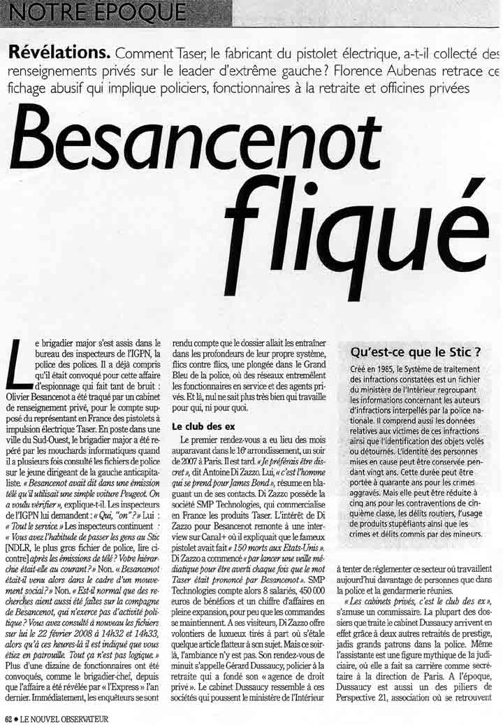 | Révélations. Comment Taser, le fabricant du pistolet électrique, a-t-il collecté des renseignements privés sur le leader d'extrême gauche? Florence Aubenas retrace ce fichage abusif qui implique policiers, fonctionnaires à la retraite et officines privées Besancenot fliqué |