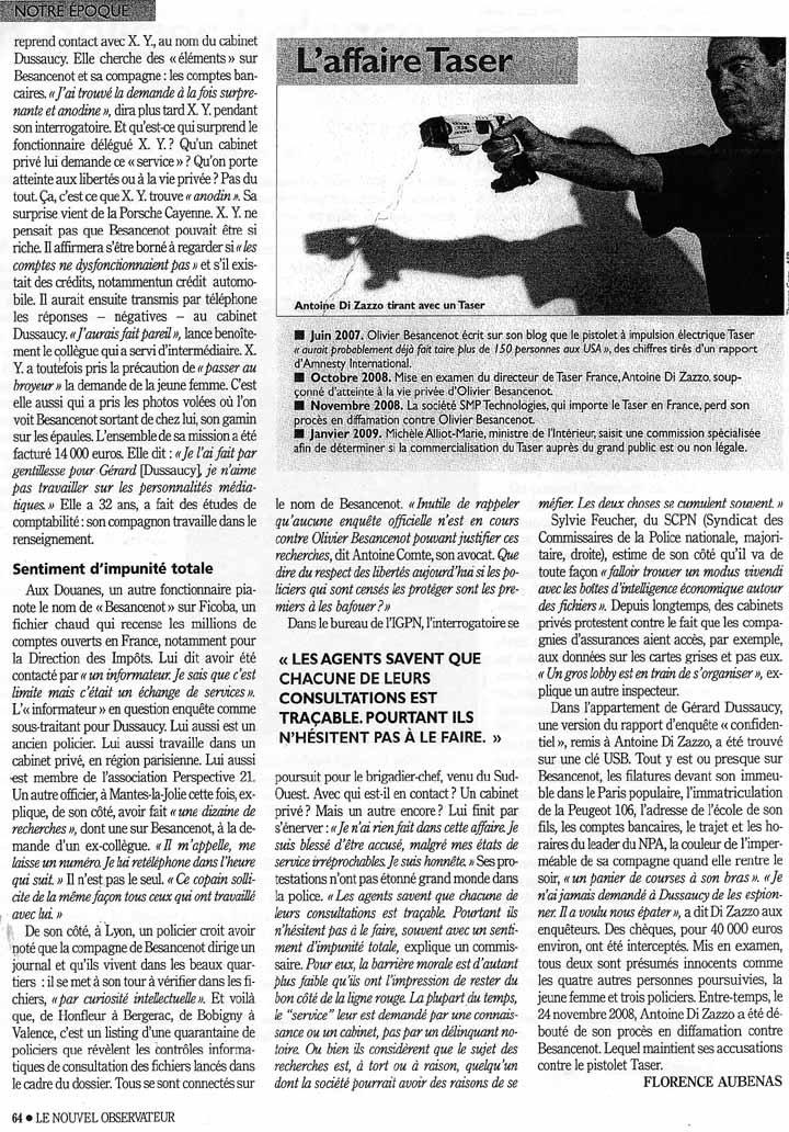 méfier. Les deux choses se cumulent souvent. » Sylvie Feucher, du SCPN (Syndicat des Commissaires de la Police nationale, majoritaire, droite), estime de son côté qu'il va de toute façon «falloir trouver un modus vivendi avec les boîtes d'intelligence économique autour des fichiers». Depuis longtemps, des cabinets privés protestent contre le fait que les compagnies d'assurances aient accès, par exemple,aux données sur les cartes grises et pas eux « Un gros lobby est en train de s'organiser », explique un autre inspecteur. Dans l'appartement de Gérard Dussaucy, une version du rapport d'enquête « confidentiel », remis à Antoine Di Zazzo, a été trouvé sur une clé USB. Tout y est ou presque sur Besancenot, les filatures devant son immeuble dans le Paris populaire, l'immatriculation de la Peugeot 106, l'adresse de l'école de son fils, les comptes bancaires, le trajet et les horaires du leader du NPA, la couleur de l'imperméable de sa compagne quand elle rentre le soir, « un panier de courses à son bras». «Je n'ai jamais demandé à Dussaucy de les espionner Il a voulu nous épater », a dit Di Zazzo aux enquêteurs. Des chèques, pour 40 000 euros environ, ont été interceptés. Mis en examen, tous deux sont présumés innocents comme les quatre autres personnes poursuivies, la jeune femme et trois policiers. Entre-temps, le 24 novembre 2008, Antoine Di Zazzo a été débouté de son procès en diffamation contre Besancenot. Lequel maintient ses accusations contre le pistolet Taser. FLORENCE AUBENAS |
