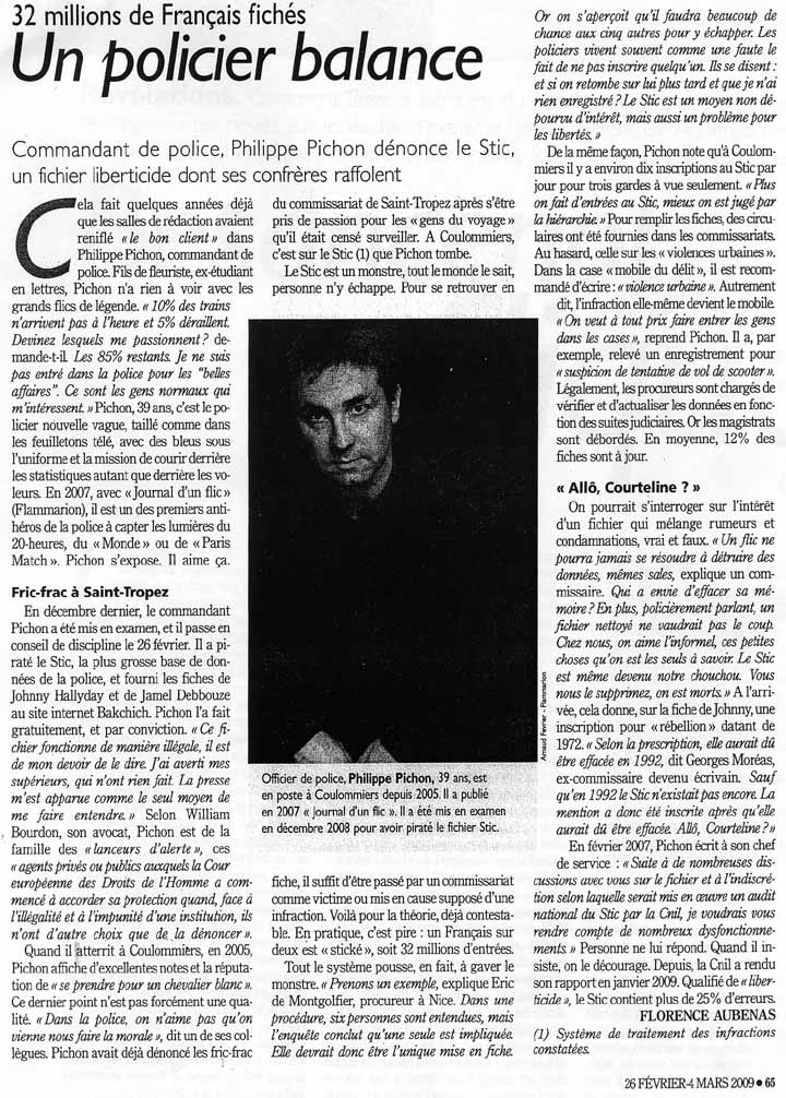Cela fait quelques années déjà que les salles de rédaction avaient reniflé « le bon client » dans Philippe Pichon, commandant de police. Fils de fleuriste, ex-étudiant en lettres, Pichon n'a rien à voir avec les grands flics de légende. « 10% des trains n'arrivent pas à l'heure et 5% déraillent. Devinez lesquels me passionnent? demande-t-il Les 85% restants. Je ne suis pas entré dans la police pour les "belles affaires" Ce sont les gens normaux qui m'intéressent. » Pichon, 39 ans, c'est le policier nouvelle vague, taillé comme dans les feuilletons télé, avec des bleus sous l'uniforme et la mission de courir derrière les statistiques autant que derrière les voleurs. En 2007, avec «Journal d'un flic» Fric-frac à Saint-Tropez En décembre dernier, le commandant Pichon a été mis en examen, et il passe en conseil de discipline le 26 février. Il a piraté le Stic, la plus grosse base de données de la police, et fourni les fiches de Johnny Hallyday et de Jamel Debbouze au site internet Bakchich. Pichon l'a fait gratuitement, et par conviction. « Ce fichier fonctionne de manière illégale, il est de mon devoir de le dire. J'ai averti mes supérieurs, qui n'ont rien fait. La presse m'est apparue comme k seul moyen de me faire entendre. » Selon William Bourdon, son avocat, Pichon est de la famille des « lanceurs d'alerte », ces «agents privés ou publics auxquels la Cour européenne des Droits de l'Homme a commencé à accorder sa protection quand, face à l'illégalité et à l'impunité d'une institution, ils n'ont d'autre choix que de la dénoncer ». Quand il atterrit à Coulommiers, en 2005, Pichon affiche d'excellentes notes et la réputation de «se prendre pour un chevalier blanc ». |