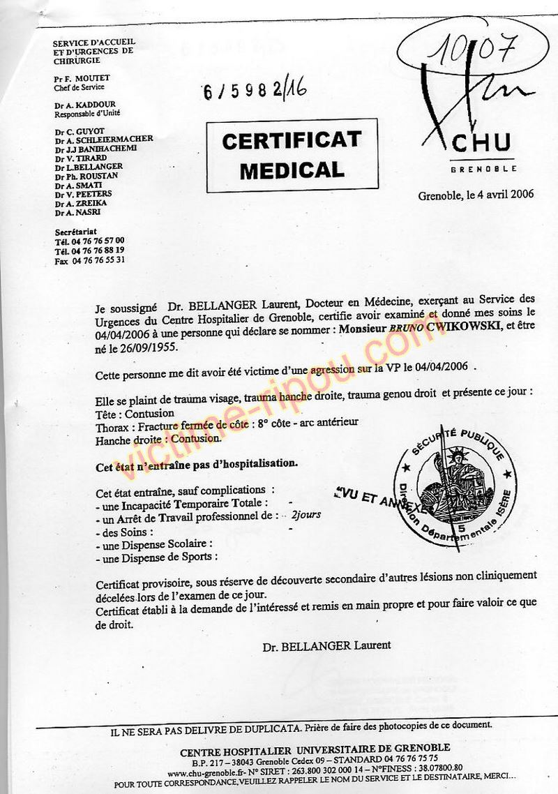 Pièces jointes de parti civile (la veille), et à l'audience du 14 oct. 2009 en rétorsion contre le témoin DESCOURS, suite a sa tentative de faire la lumière sur les faux documents demandés par des magistrats à des policiers et des médecins pour couvrir la vengeance de CWIKOWSKI. (Verdict 26 novembre 2009)