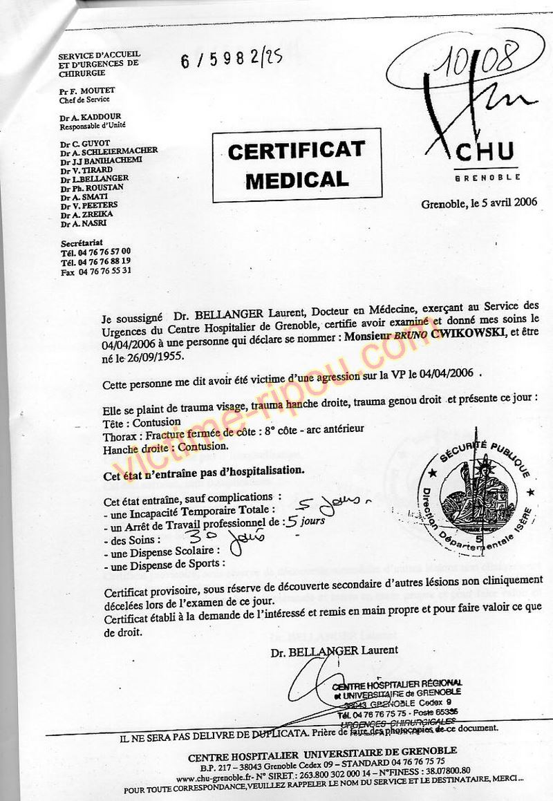 Pièces jointes de parti civile (la veille), et à l'audience du 14 oct. 2009 en rétorsion contre le témoin DESCOURS, suite a sa tentative de faire la lumière sur les faux documents demandés par des magistrats à des policiers et des médecins pour couvrir la vengeance de CWIKOWSKI. (Verdict 26 novembre 2009)