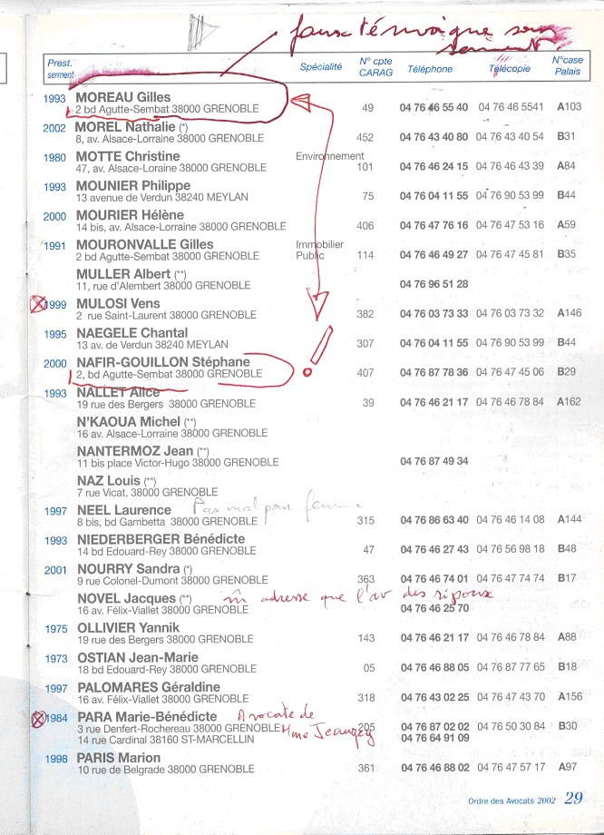 15 jours après les coups de CWIKWOSKI du 4 avril 2006, la déposition d'un faux témoin adverse MOREAU Gilles avocat est rajoutée par le juge PRADIER Jean-Pierre pour palier aux incohérences des dépositions des deux autres faux témoins sollicités dans la précipitation. Qui a sollicité cette fausse déposition ? Des magistrats corrompus dénoncés ? Des confrères avocats ? ... La plainte pour ce lien parmi 500 avocats de GRENOBLE (une preuve ci-dessous. Encore un hasard) |