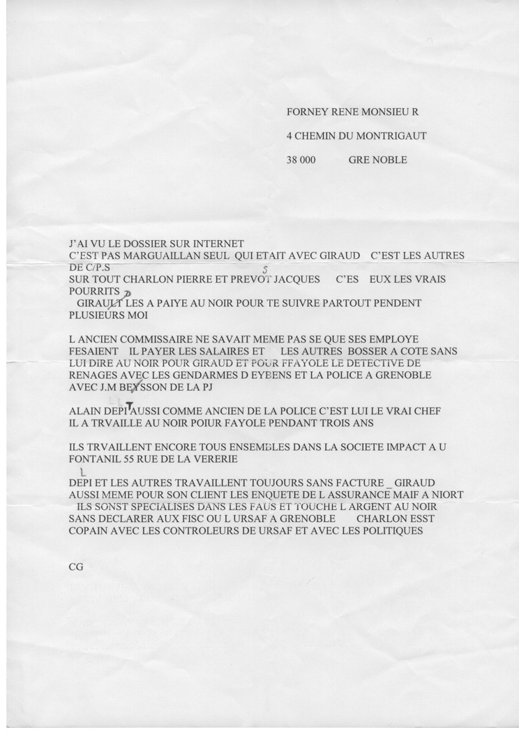 Après 4 mois de prison ferme, le 3 mars 2005, les 2 compères MM CWIKOWSKI Bruno et CHOUTEAU Jean-Bernard comparaissent libres (libérés sous cautions ?) en audience correctionnelle du TGI de Grenoble : Pour corruption ... détournement de données informatiques ... L'audience a été reportée parce que l'avocat du complice du commissaire révoqué (M DETROYAT) disait plaider aussi aux assises (en fait : mes 3000 publicités gênaient).