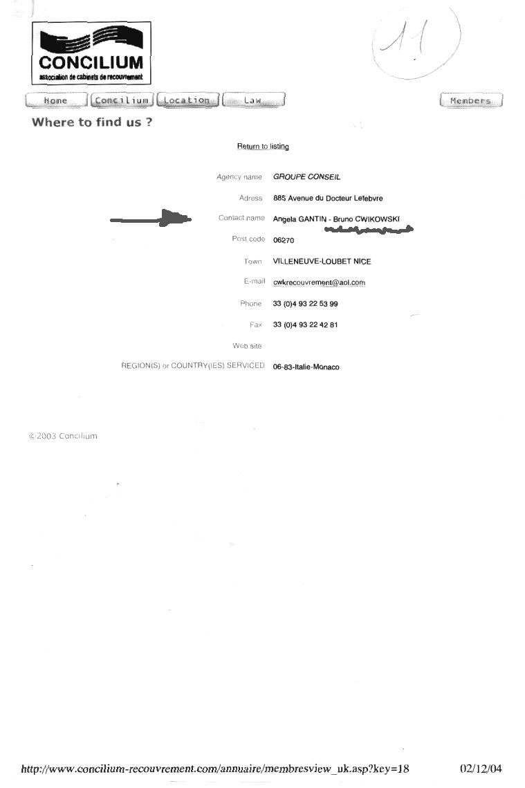 (Modification après l'arrestation de CWIKOWSKI ) La société dans le Var, à CWIKOWSKI bruno, où est sociétaire sa compagne (Angéla GANTIN) présente au tribunal de Grande Instance de Grenoble les 3 mars et 16 juin 2005. (Avant !) Concilium ? |