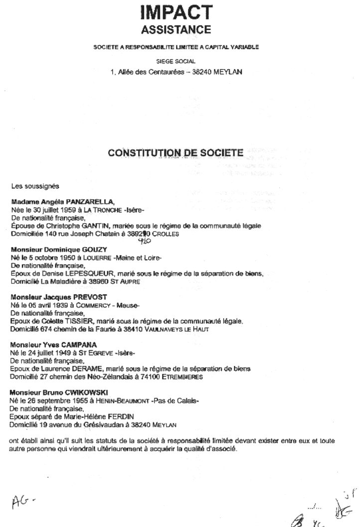 Création de cette société IMPACT en remplacement de CPS dissoute 2 semaines après le dépos de ma plainte à Jacques FAYEN Procureur de la République au palais de justice de Grenoble (Isère) M CWIKOWSKI, commissaire révoqué,