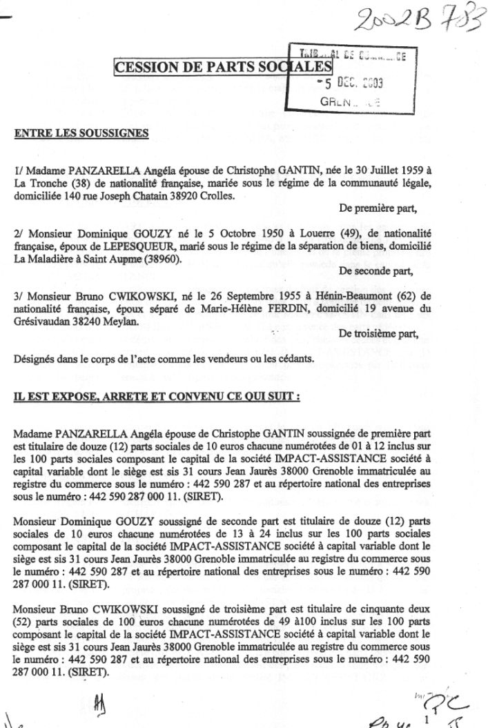 Vente des parts de IMPACT de CWIKOWSKI, après son arrestation. (Voir bas de page)