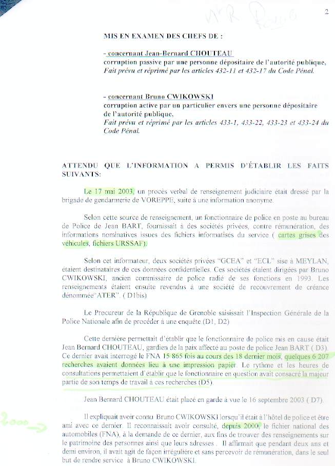Selon cet informateur, deux sociétés privées "GCEA" et "ECL" sise à MEYLAN, étaient destinataires de ces données confidentielles. Ces sociétés étaient dirigées par Bruno CWIKOWSKI, ancien commissaire de police radié de ses fonctions en 1993. Les renseignements étaient ensuite revendus à une société de recouvrement de créance dénommée"ATER". ( Dl bis)