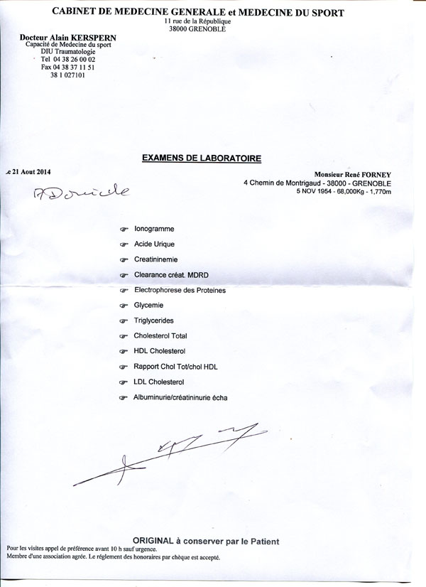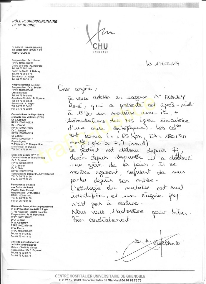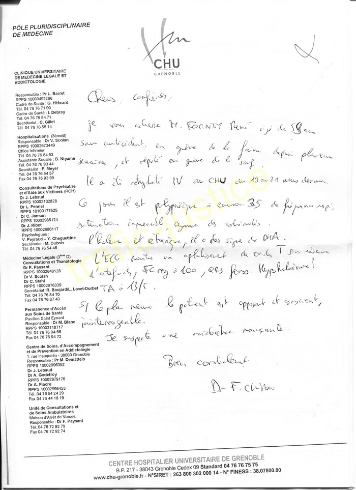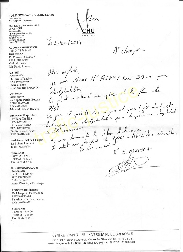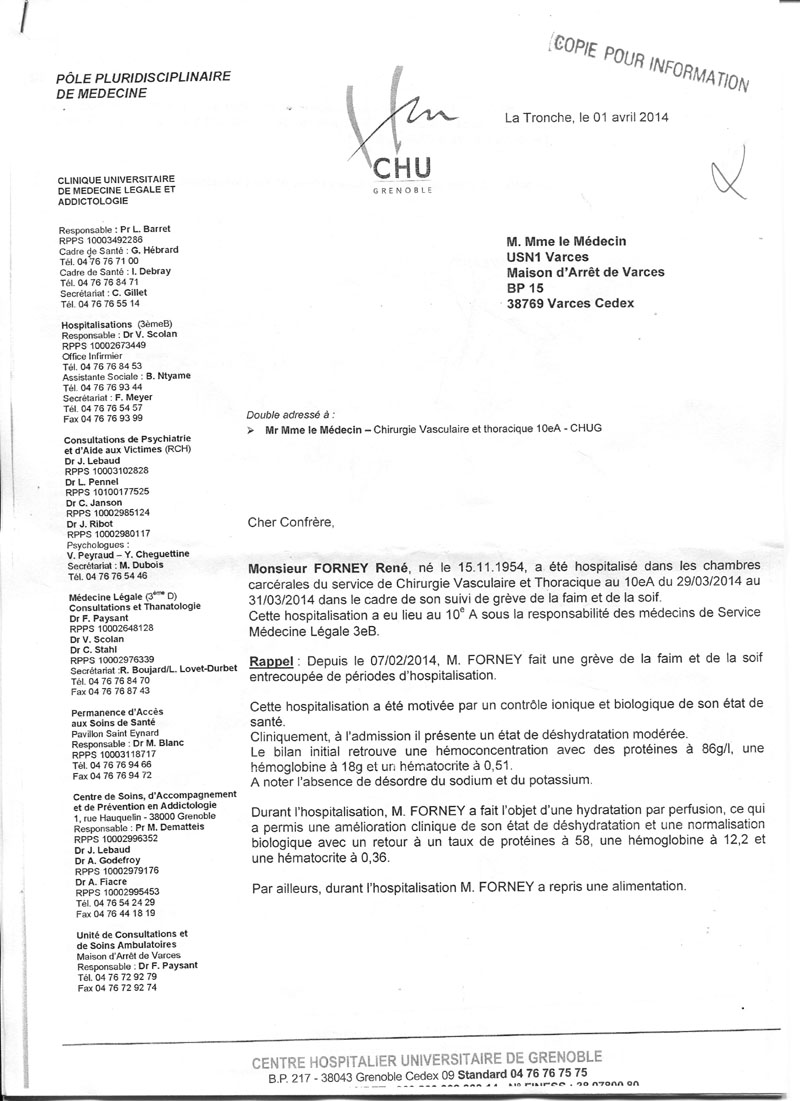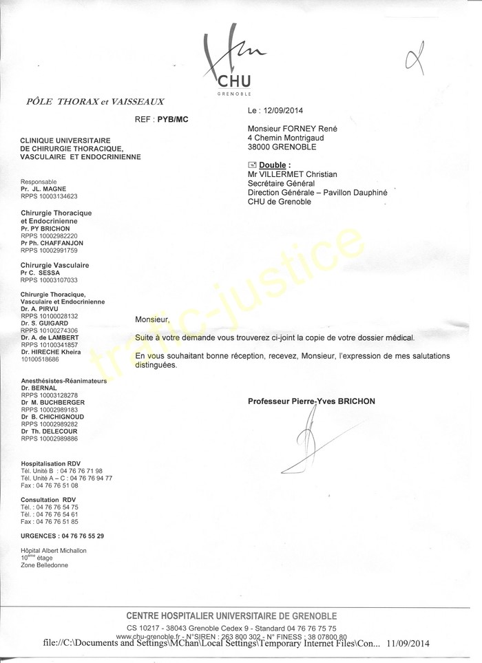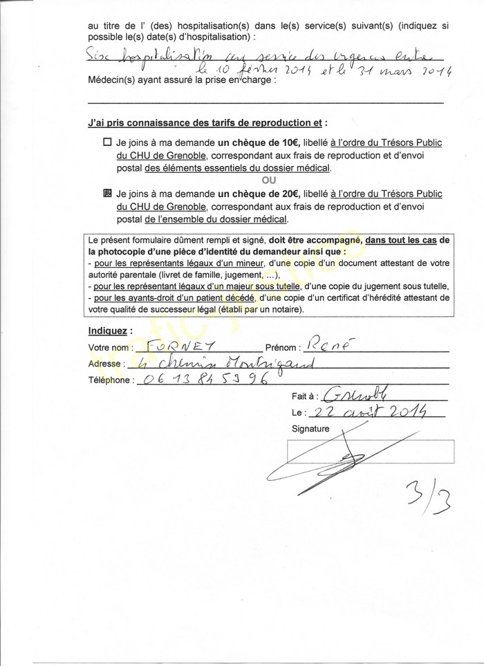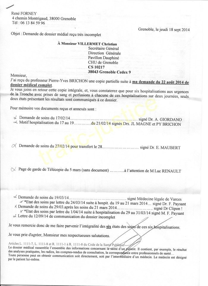 Je vous joins en retour cette copie intégrale, et, vous constaterez que pour six hospitalisations aux urgences de la Tronche avec prises de sang et perfusions à chacune de ces hospitalisations sur deux journées, seuls deux états présentant les résultats sont communiqués à ce dossier.