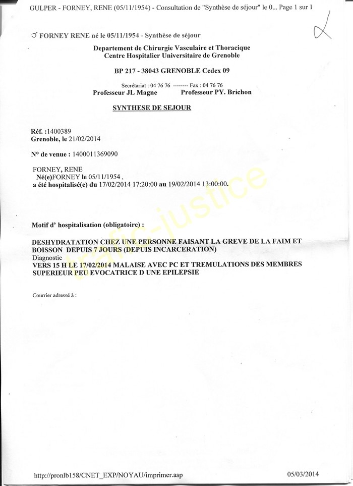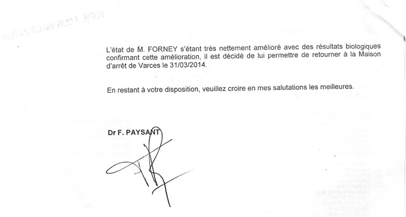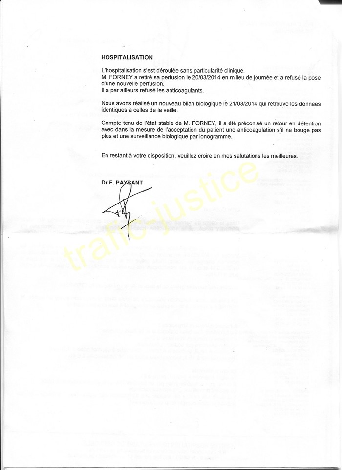*Etat des soins par lettre du 24/03/14 suite à hospit. du 19 au 21 mars 2014… signé Dr. F. Paysant