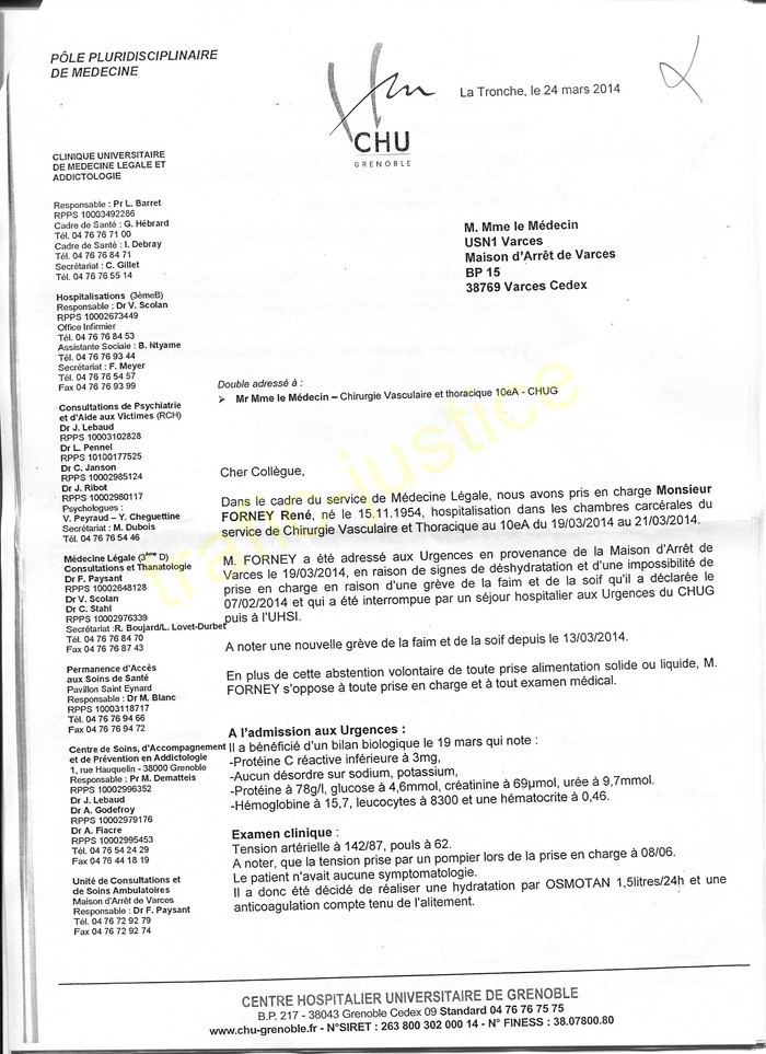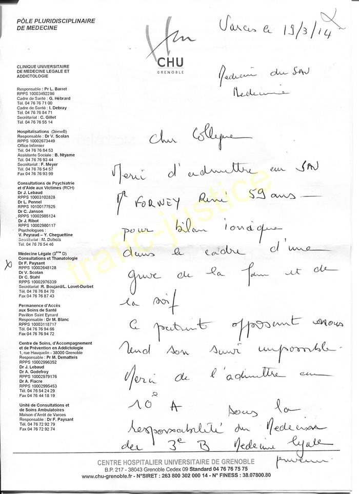 Demande de soins du 19/03/14…………………….….. signé Médecine légale de Varces