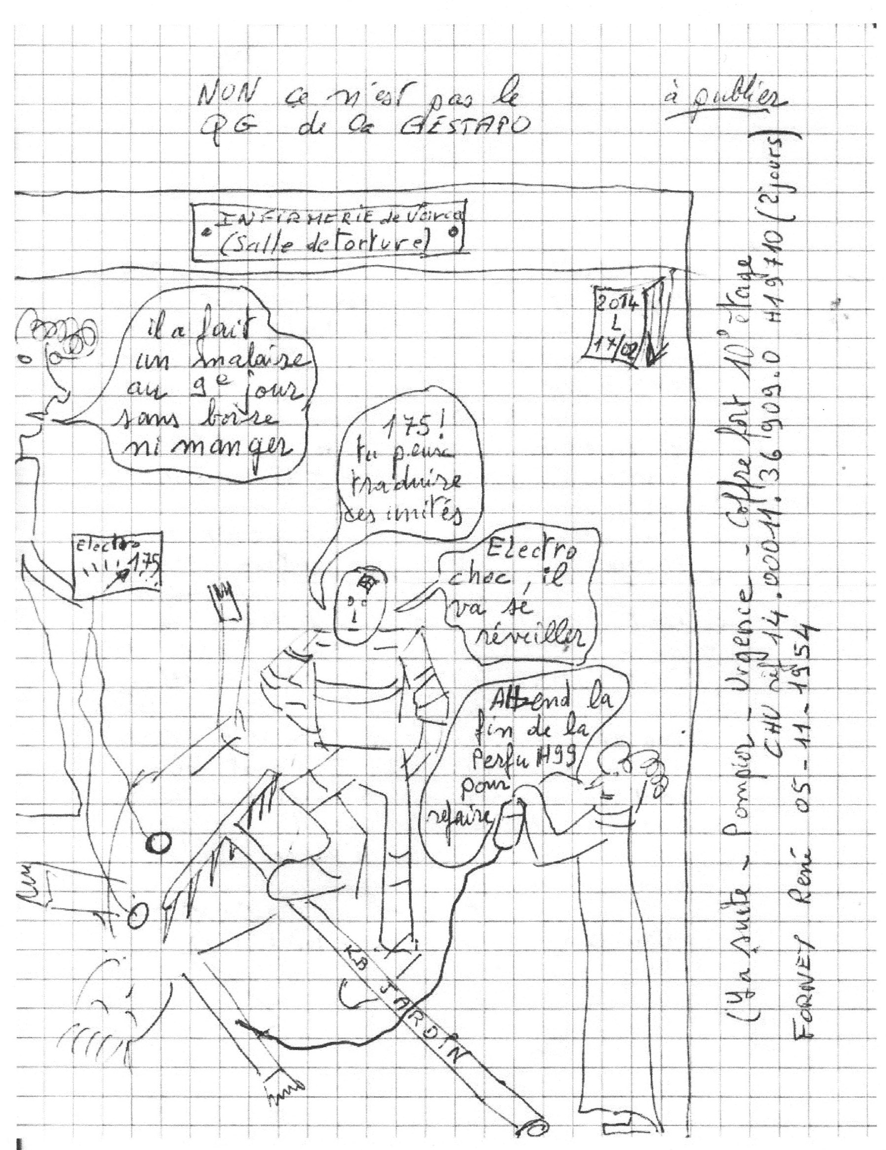 Croquis reproduit en plus de dix exemplaires et semé sous enveloppes affranchies lors des transferts pour contourner la censure des gardiens - Celui-ci est arrivé à destination.