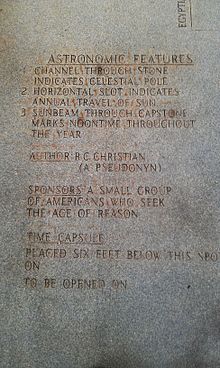 Six blocs de granite de 5,87 mètres de haut pour un poids total de 237 746 livres 3 (soit presque 108 tonnes), affichent un message en plusieurs langues. La plaque du haut comporte des inscriptions en quatre langues sur ses côtés : babylonien , grec ancien , sanskrit et hiéroglyphe égyptien , qui définissent l'objectif de la structure : « Que ces pierres nous guident vers un âge de la raison » 1 . Un trou dans la pierre horizontale du haut donne la date à midi. Un trou montre l'étoile polaire dans la colonne centrale.